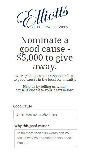 Landing pages: 3WH created custom landing pages for Elliott's website to promote the charitable cause and facilitate the collection of nominations in a centralised system.
