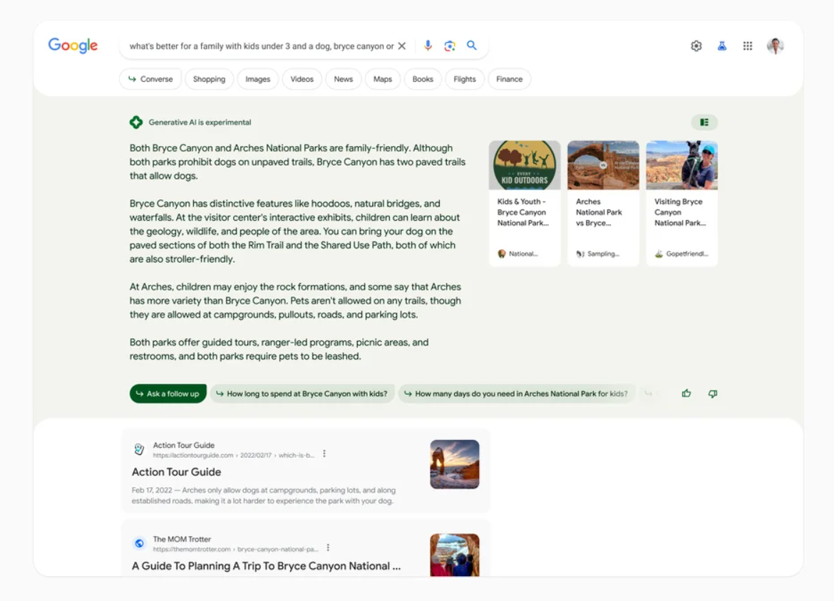 Google has unveiled its new Search Generative Experience (SGE), a search engine powered by AI that provides more visual, snackable, personal, and human answers to search queries. The new search engine displays an AI-generated answer above the search results listing, with clearly labeled citations to the websites that were used to generate the answer. Users can click on these sites for further information, follow up with additional questions, or click on the toggle button to dive deeper into the topic.